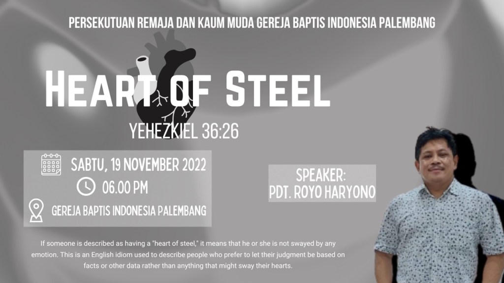 Seluruh Kaum Remaja & Pemuda diundang hadir dalam Persekutuan Gabungan pada Sabtu, 19 November 2022 pukul 18.00 WIB di GBIP, dengan acara “Heart Of Steel”. Pembicara : Pdt. Daniel Royo Haryono, S.S., M.Th., M.I.Kom.