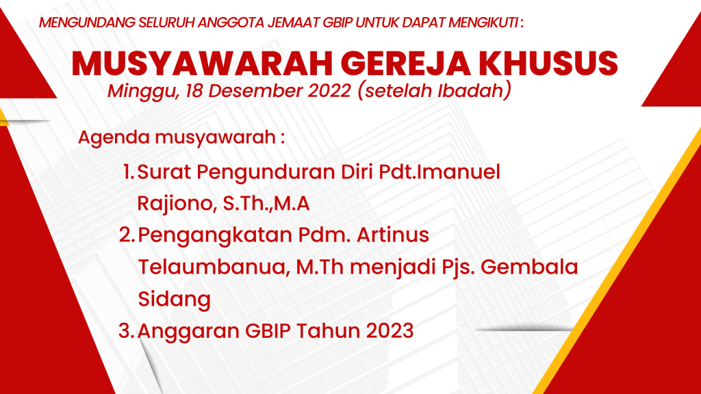 Mengingatkan pentingnya agenda rapat yang akan dibahas, mohon seluruh anggota sidang jemaat GBI Palembang dapat hadir dalam Musyawarah Urusan Gereja (MUGER) Khusus, setelah Ibadah pagi ini jam 11.00 WIB.
