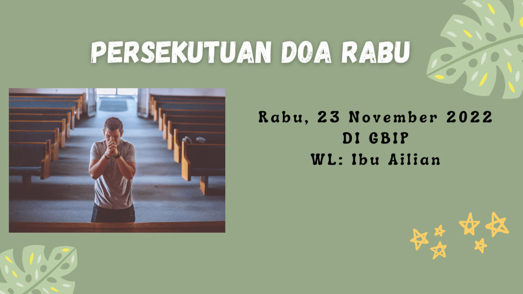 Seluruh Jemaat GBIP diundang hadir dalam Persekutuan Doa Rabu, 23 November 2022 pukul 18.00 WIB, di GBIP . WL . Ibu Ailian