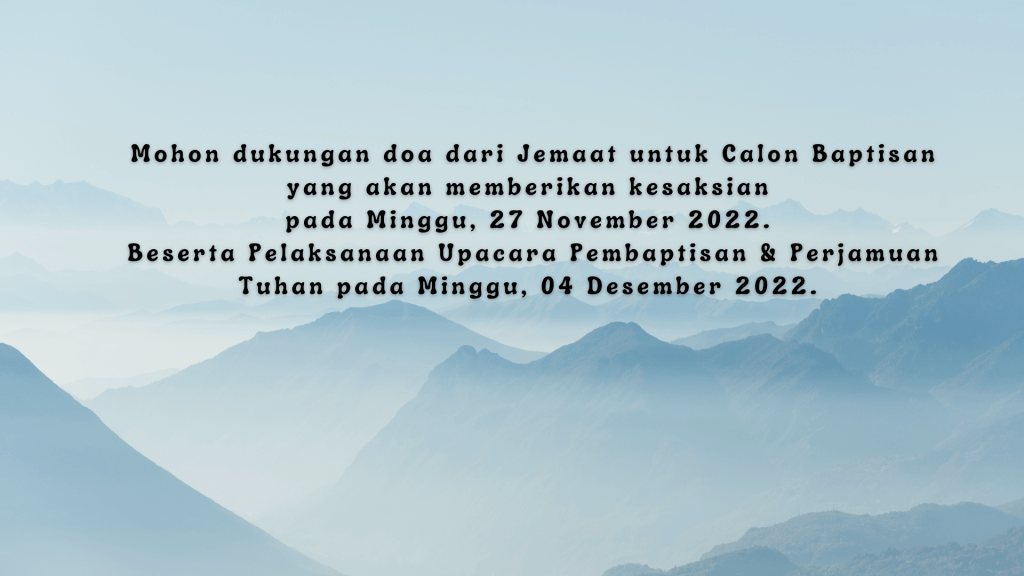 Mohon dukungan doa dari Jemaat untuk Calon Baptisan yang akan memberikan kesaksian pada Minggu, 27 November 2022. Beserta Pelaksanaan Upacara Pembaptisan & Perjamuan Tuhan pada Minggu, 04 Desember 2022.