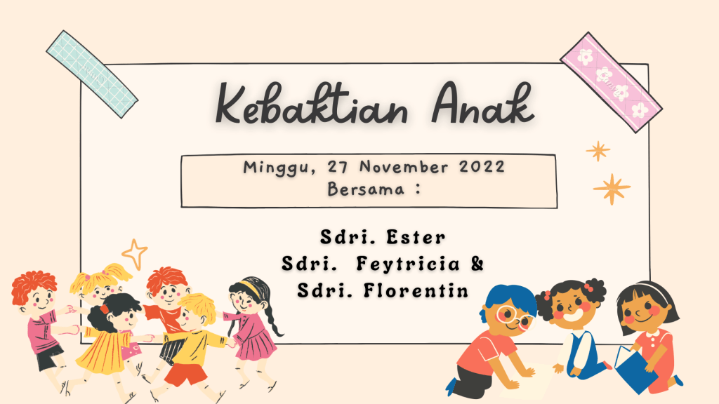 Mari anak-anak ikut bergabung dalam kebaktian anak. Minggu 27 November 2022 bersama Sdri. Ester, Sdri. Feytricia & Sdri. Florentin