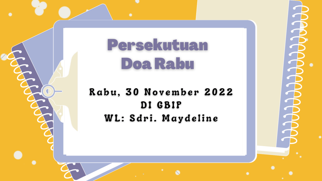 Seluruh Jemaat GBIP diundang hadir dalam Persekutuan Doa Rabu, 30 November 2022 pukul 18.00 WIB, di GBIP . WL Sdri. Maydeline.