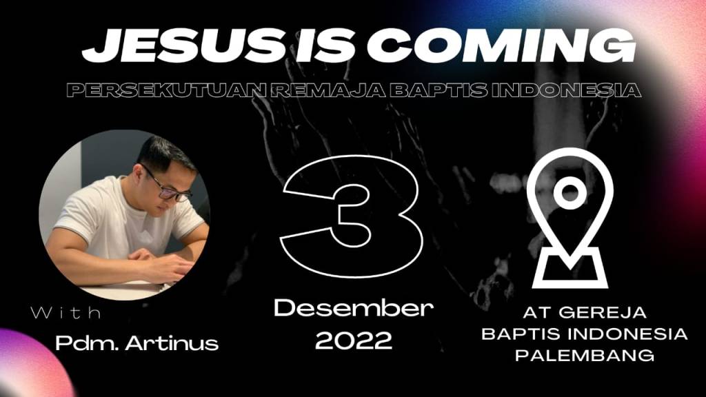 Seluruh Kaum Remaja diundang hadir dalam Persekutuan PRBI pada Sabtu, 03 Desember 2022 pukul 18.00 WIB di GBIP, dengan acara “Jesus Is Coming” Pembicara Pdm. Artinus Telaumbanua, M.Th