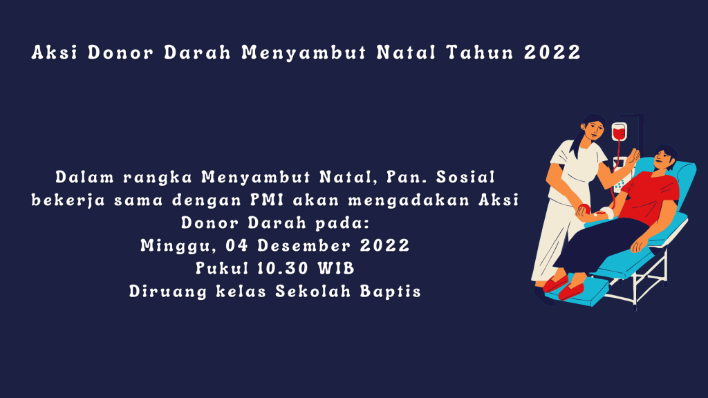 Dalam rangka Menyambut Natal, Pan. Sosial bekerja sama dengan PMI akan mengadakan Aksi Donor Darah pada Minggu, 04 Desember 2022 . Diruang kelas Sekolah Baptis