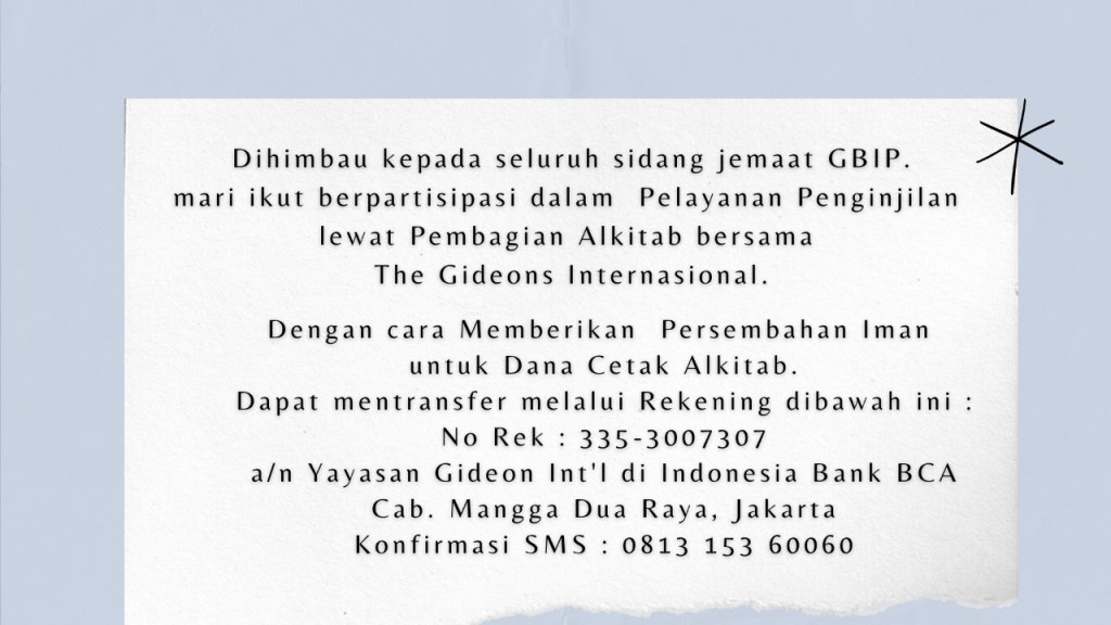 Dihimbau kepada seluruh sidang jemaat GBIP. Mari ikut berpartisipasi dalam Pelayanan Penginjilan lewat Pembagian Alkitab bersama The Gideons Internasional. Dengan Cara Memberikan Persembahan Iman untuk Dana Cetak Alkitab.