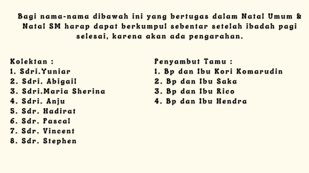 Diberitahukan bagi nama-nama diatas ini yang bertugas dalam Natal Umum & Natal SM, agar dapat berkumpul sebentar setelah ibadah pagi ini selesai, karena akan ada pengarahan.