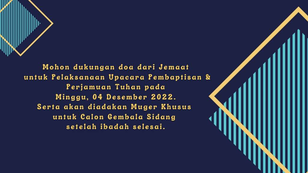 Mohon dukungan doa dari Jemaat untuk Pelaksanaan Upacara Pembaptisan & Perjamuan Tuhan pada Minggu, 04 Desember 2022. Serta akan diadakan Muger Khusus untuk Calon Gembala Sidang setelah ibadah selesai.