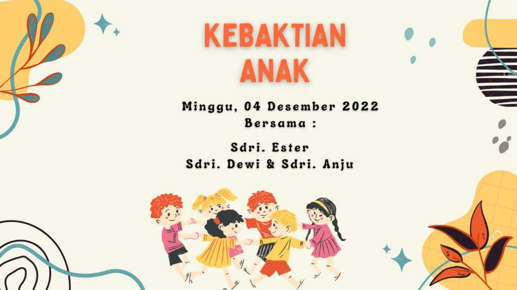 Mari anak-anak ikut bergabung dalam kebaktian anak. Minggu 04 Desember 2022 bersama Sdri. Ester, Sdri. Dewi & Sdri. Anju