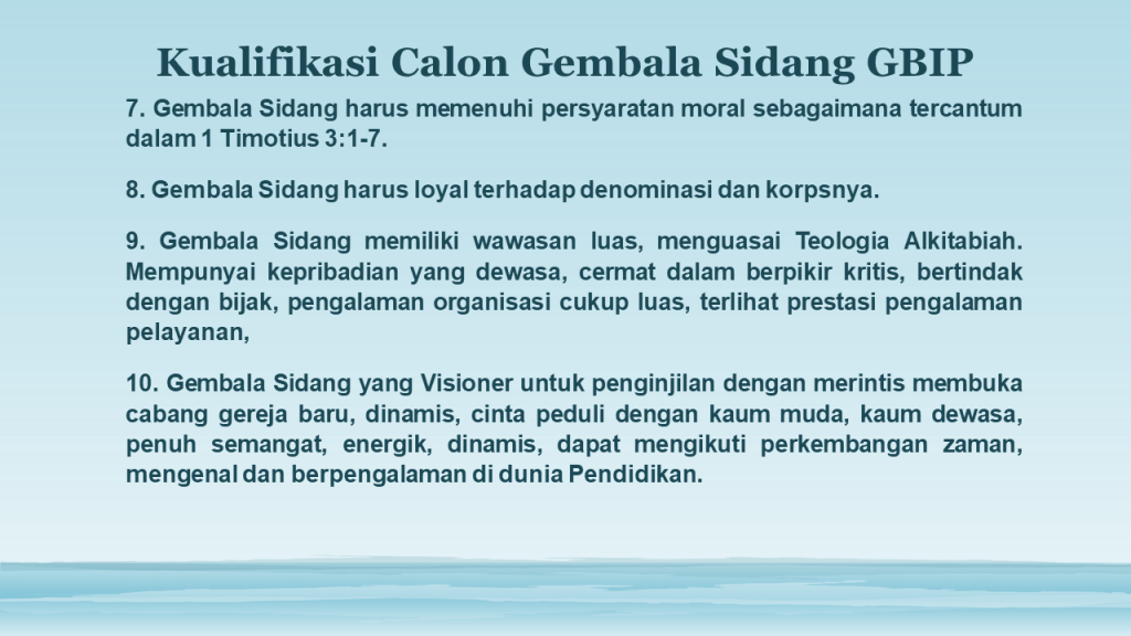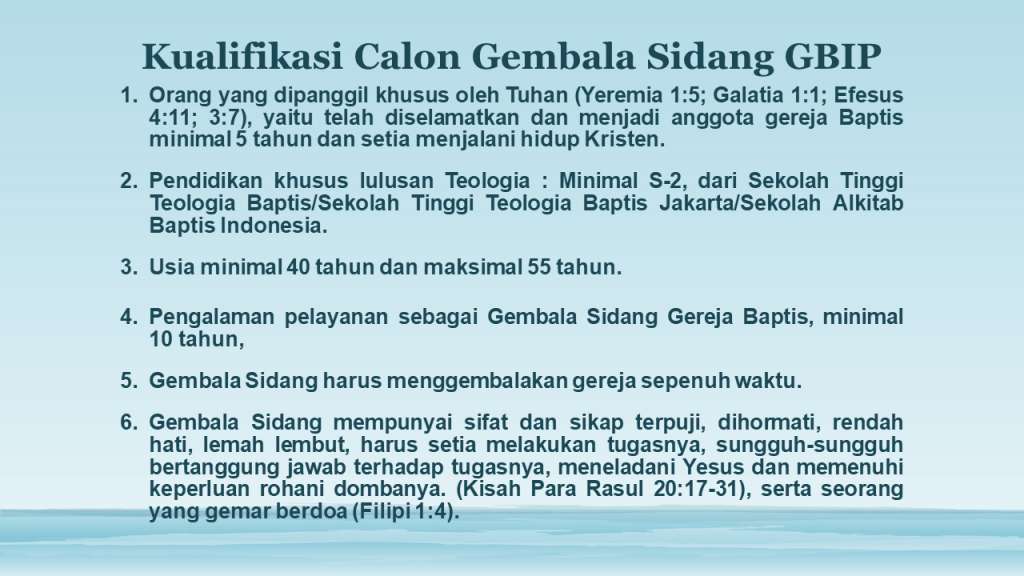 Menindaklanjuti Rapat Perdana, Panitia Pencalonan Gembala Sidang (PPGS), pada tgl. 16 Oktober 2022 dan tgl.18 November 2022. Setelah berdoa, memikirkan dan mencatat beberapa syarat kualifikasi umum dan kualifikasi khusus calon Gembala Sidang baru, yang akan dipanggil dengan kriteria syarat Calon GS GBIP sebagai berikut :