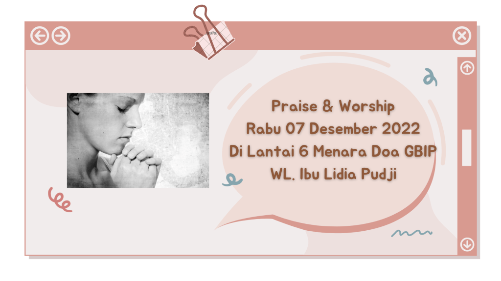 Seluruh Jemaat GBIP di undang hadir dalam Persekutuan Praise & Worship, tgl. 07 Desember 2022 pukul 18.00 WIB, di Menara Doa GBIP Lantai 6 . WL Ibu Lidia Pudji.